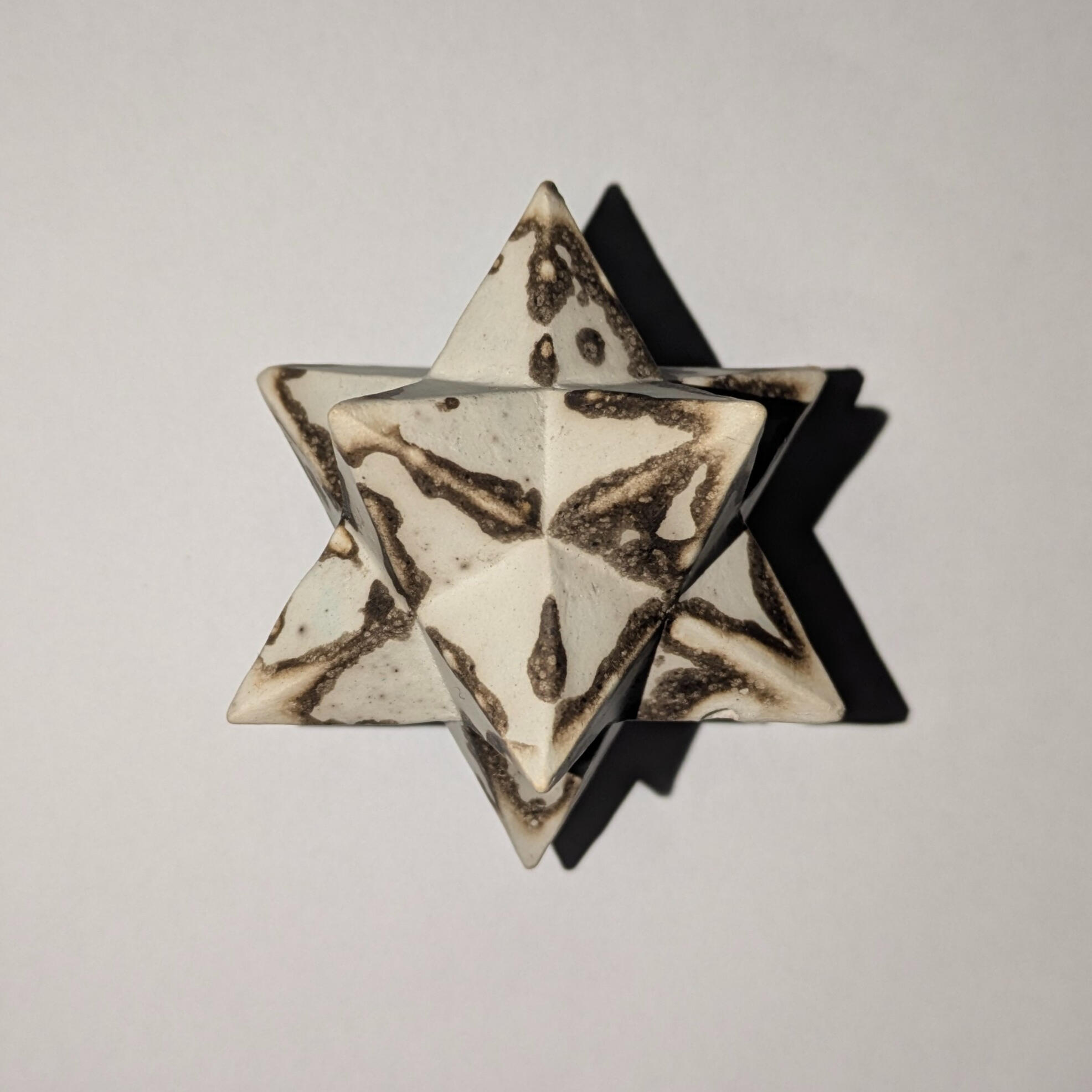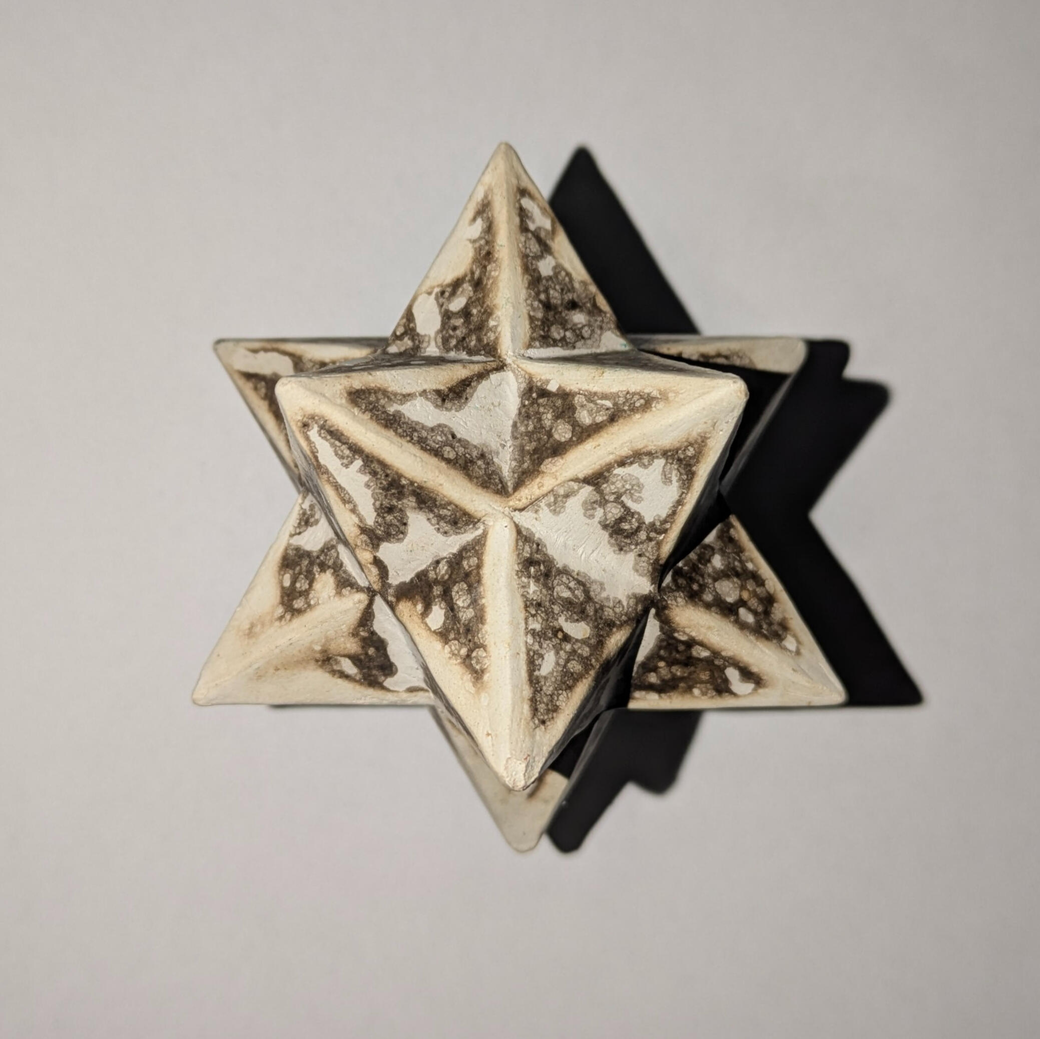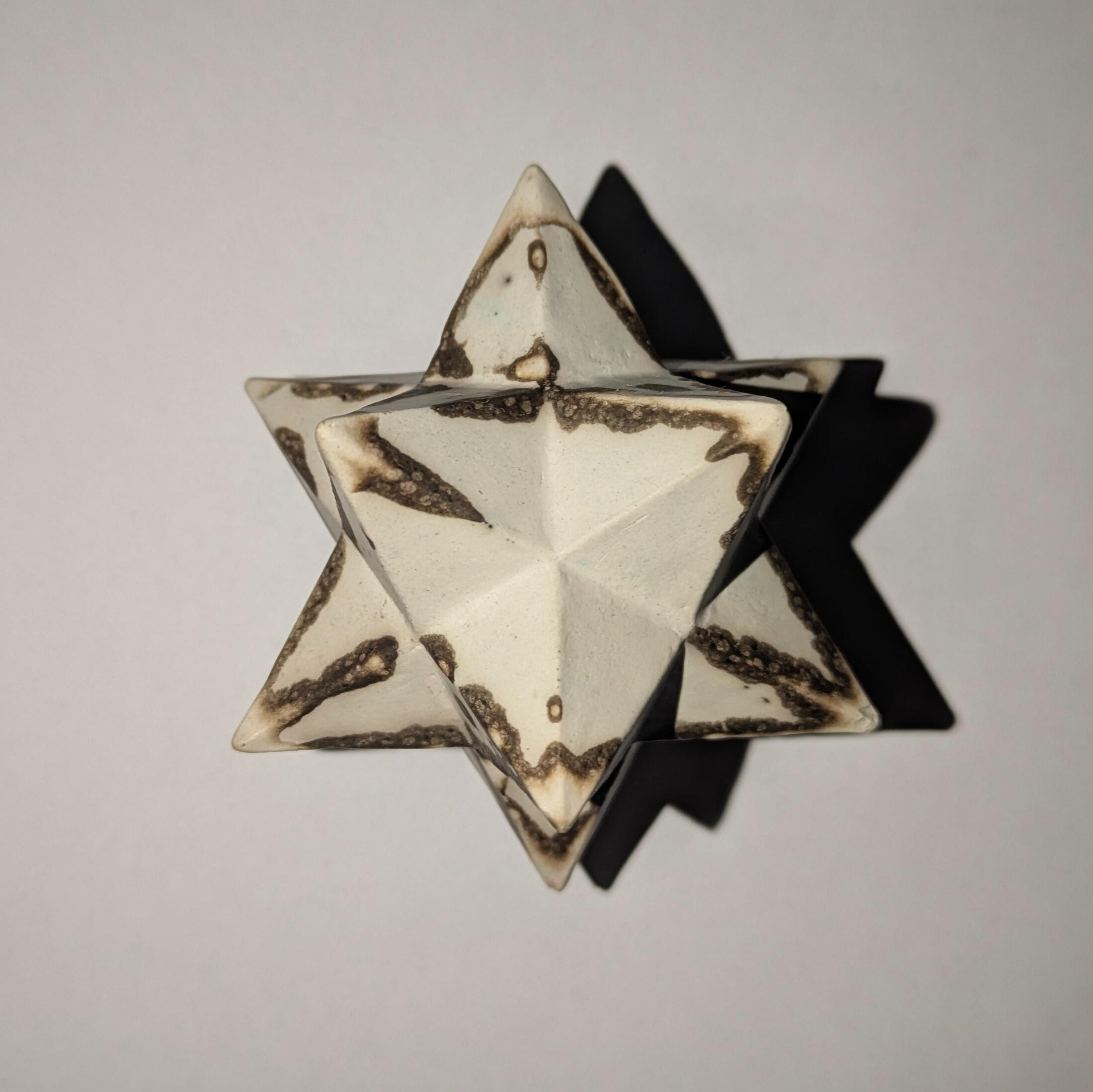 This slipcast form is a stellated dodecahedron, a 12 sided shape with each side 'stellated' or turned into a point. The mould creation was a real head-scratcher but eventually came to fruition as a 4-part mould. From this, and another smaller mould, I created the components for my piece 'In Quiet Orbit' which I exhibited (in my first exhibition) with Artlandish in Hereford.