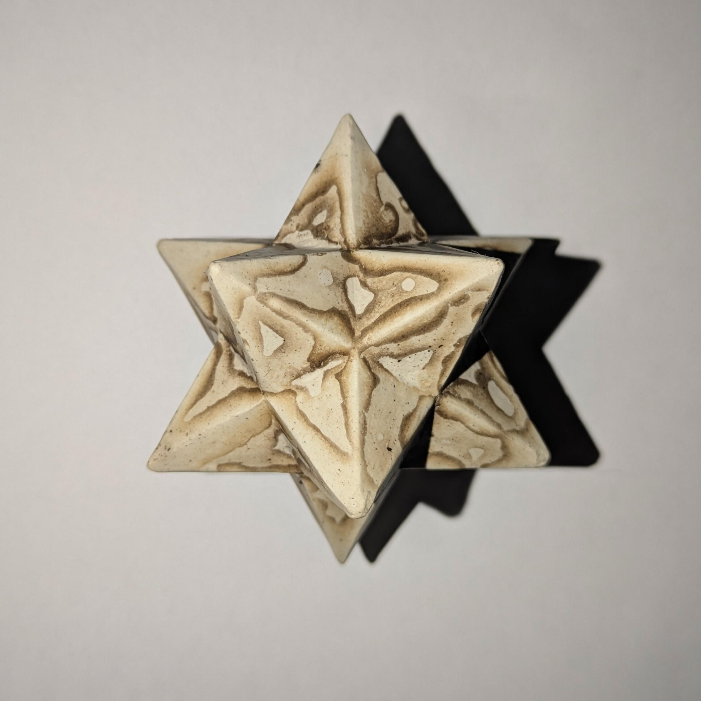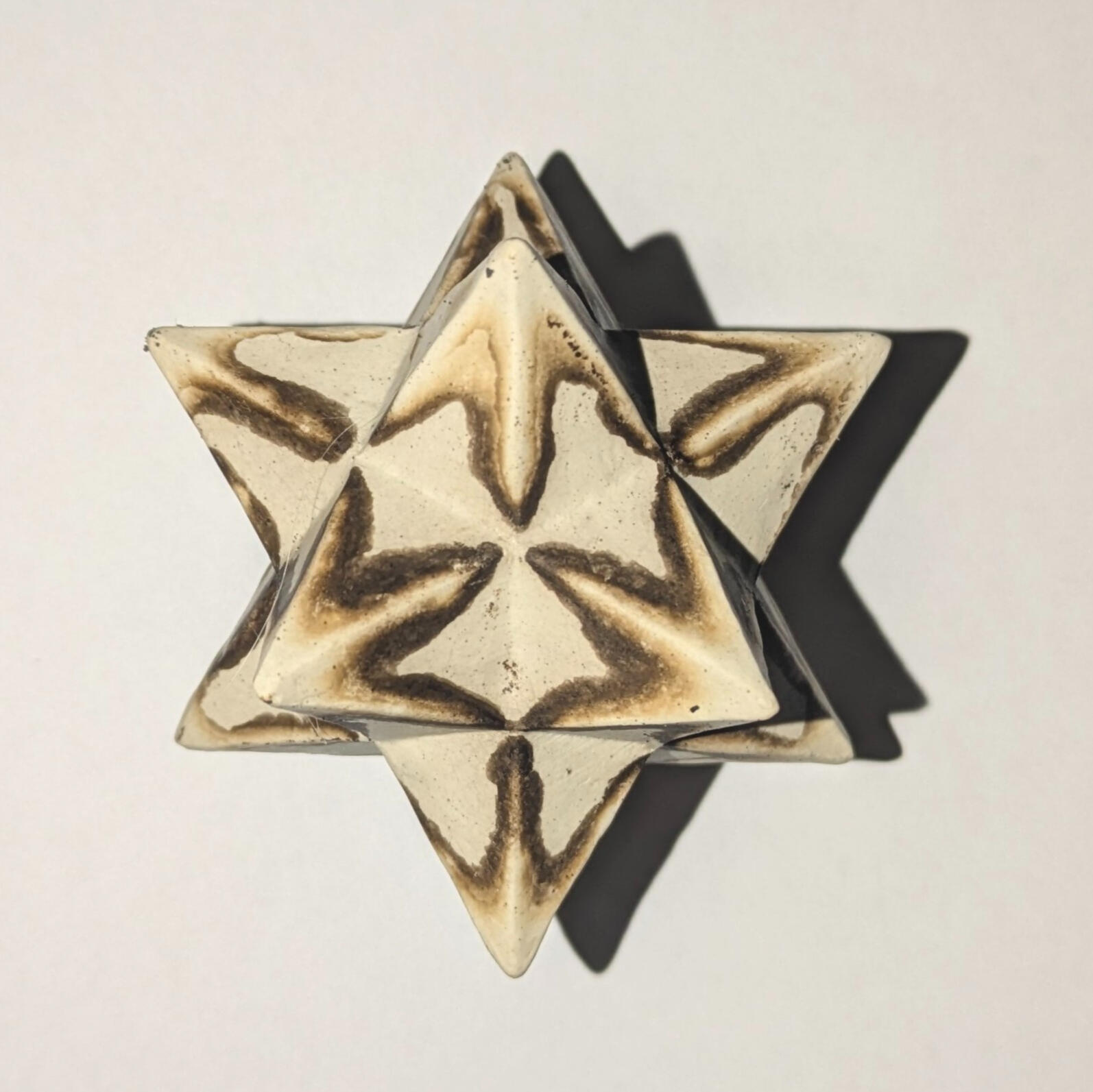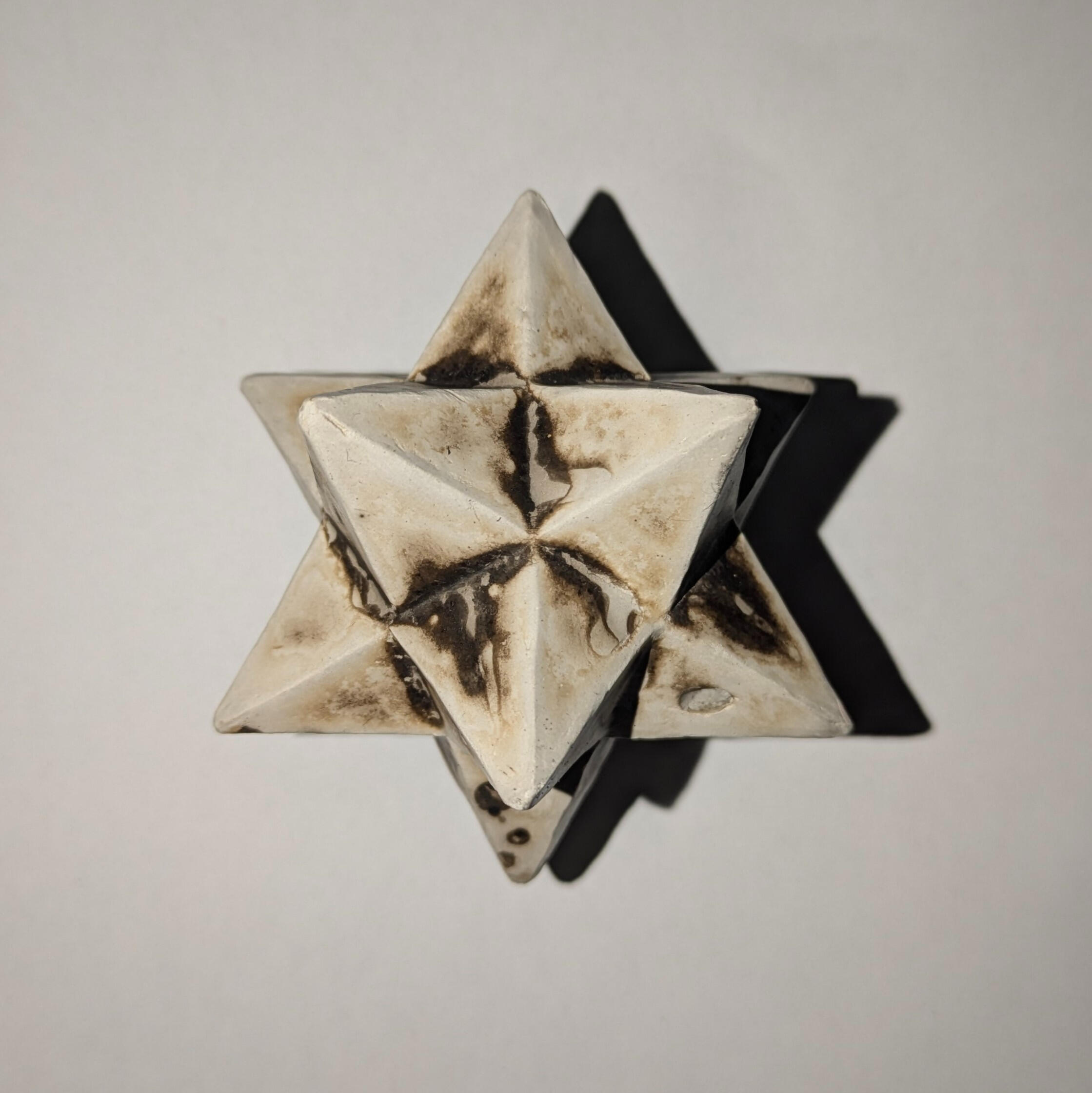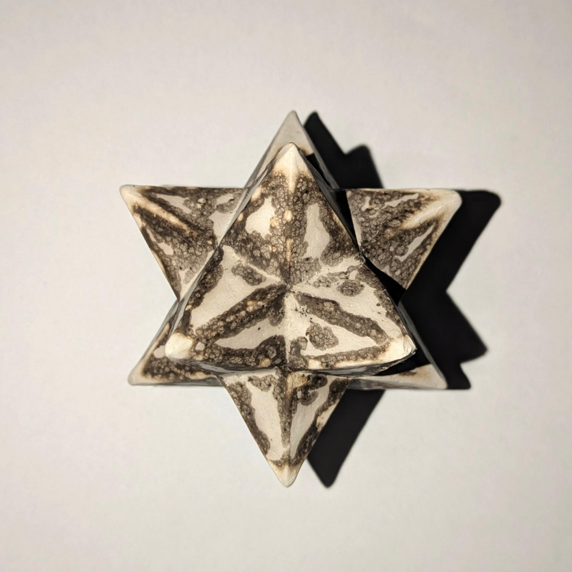 This slipcast form is a stellated dodecahedron, a 12 sided shape with each side 'stellated' or turned into a point. The mould creation was a real head-scratcher but eventually came to fruition as a 4-part mould. From this, and another smaller mould, I created the components for my piece 'In Quiet Orbit' which I exhibited (in my first exhibition) with Artlandish in Hereford.