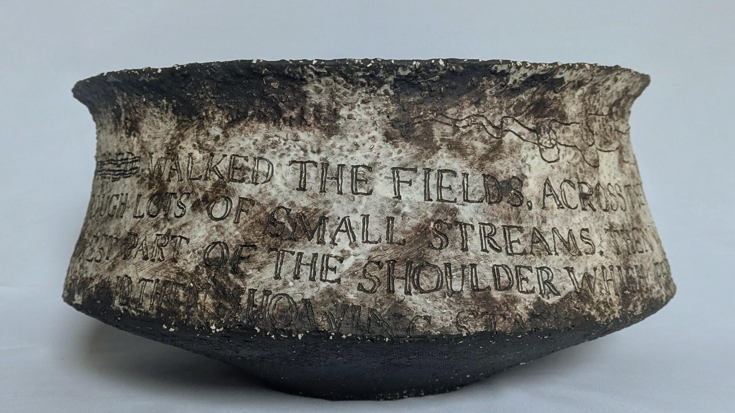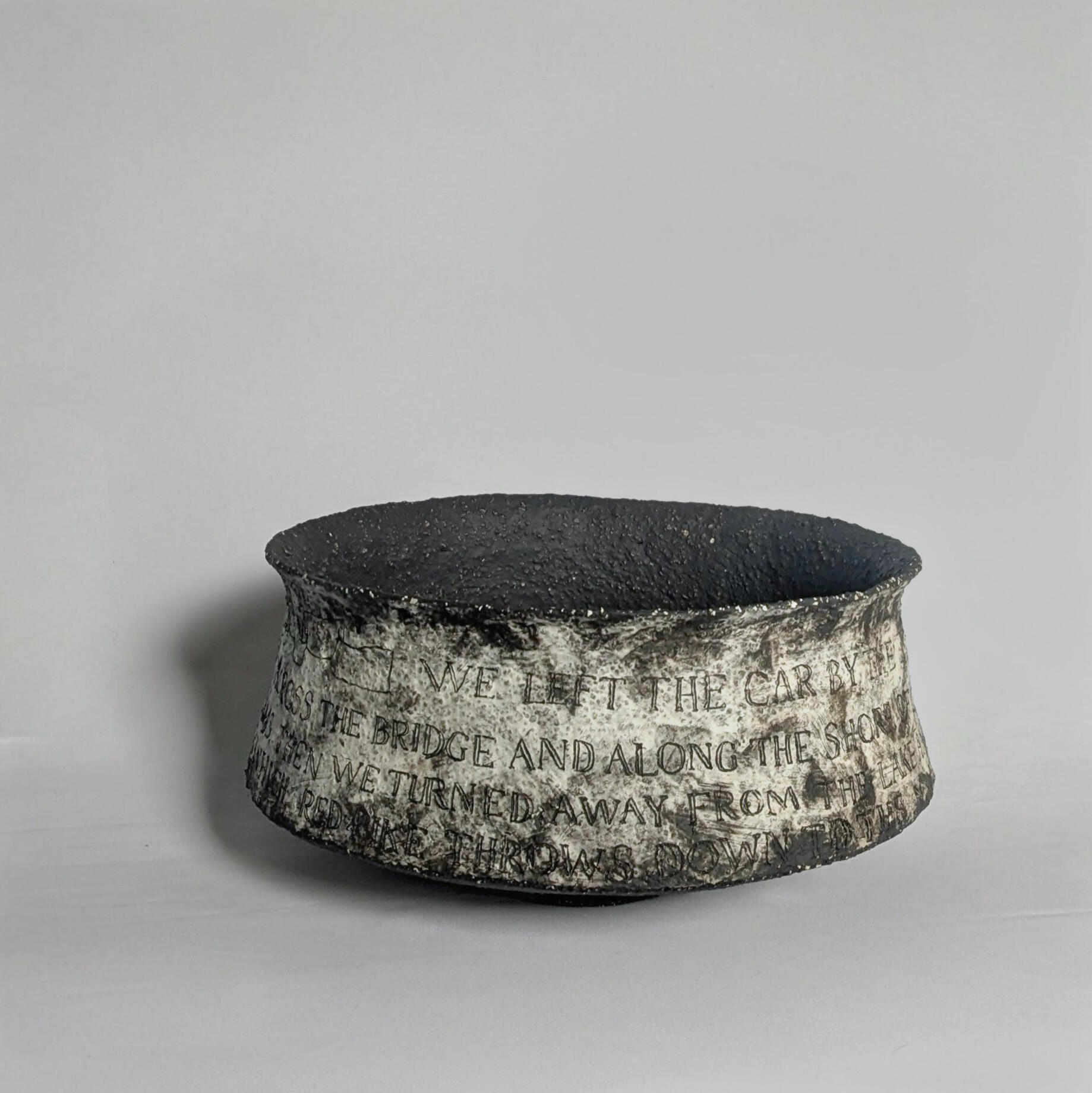 This ongoing project started after reading about cuneiform writing on clay tablets and thinking about what texts would be found in the future from today, given that most writing is on paper or hard-drives. The first bowl in the project shows an excerpt from my grandfathers diary. The bowl is slab built, using a template which was created using a formula and which incorporates the golden ratio.